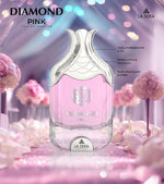 Το Diamond Pink είναι ένα λαμπερό και κομψό άρωμα που αποπνέει φρεσκάδα και λουλουδάτη κομψότητα. Ανοίγει με τραγανές νότες κορυφής από yuzu, ρόδι και παγωμένα ακόρντα, δημιουργώντας μια φωτεινή και αναζωογονητική εισαγωγή.